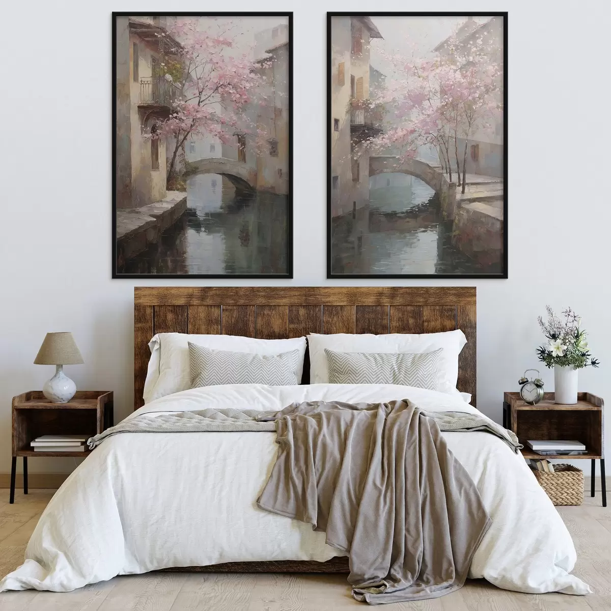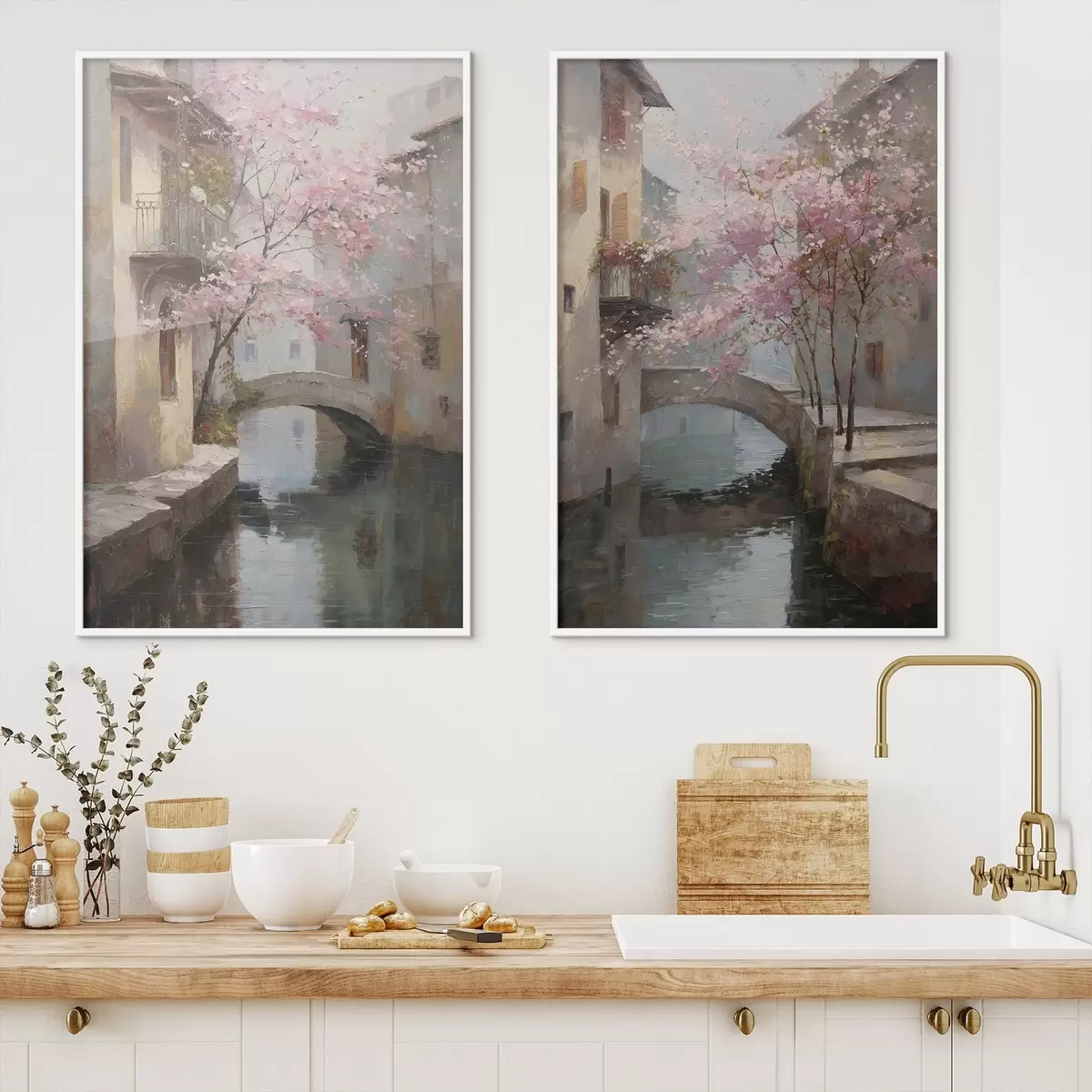 Poster Romantisches Stadtbild mit einem blühenden Baum im Stil eines Ölgemäldes d01173