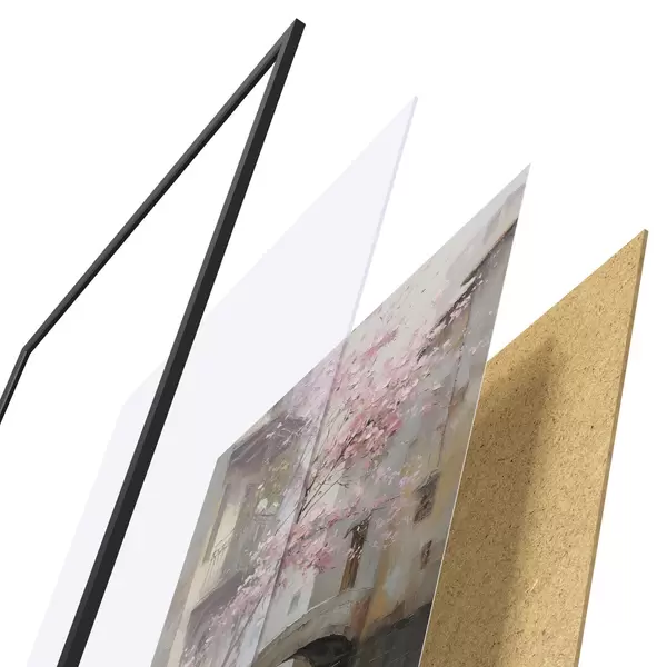 Das Poster besteht aus einem Rahmen, Plexiglas, einem gedruckten Bild und einer Rückwand aus Spanplatten. Dank der Halterungen auf der Rückseite kann das Poster sofort an die Wand gehängt werden.