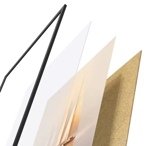 Das Poster besteht aus einem Rahmen, Plexiglas, einem gedruckten Bild und einer Rückwand aus Spanplatten. Dank der Halterungen auf der Rückseite kann das Poster sofort an die Wand gehängt werden.