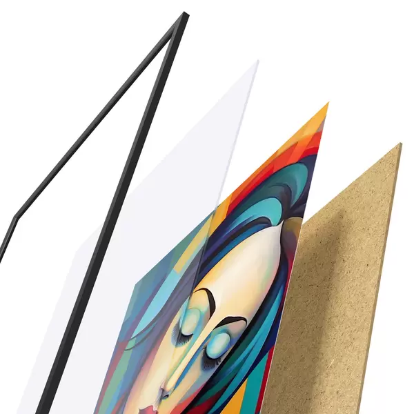 Das Poster besteht aus einem Rahmen, Plexiglas, einem gedruckten Bild und einer Rückwand aus Spanplatten. Dank der Halterungen auf der Rückseite kann das Poster sofort an die Wand gehängt werden.