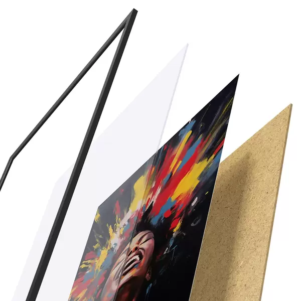 Das Poster besteht aus einem Rahmen, Plexiglas, einem gedruckten Bild und einer Rückwand aus Spanplatten. Dank der Halterungen auf der Rückseite kann das Poster sofort an die Wand gehängt werden.