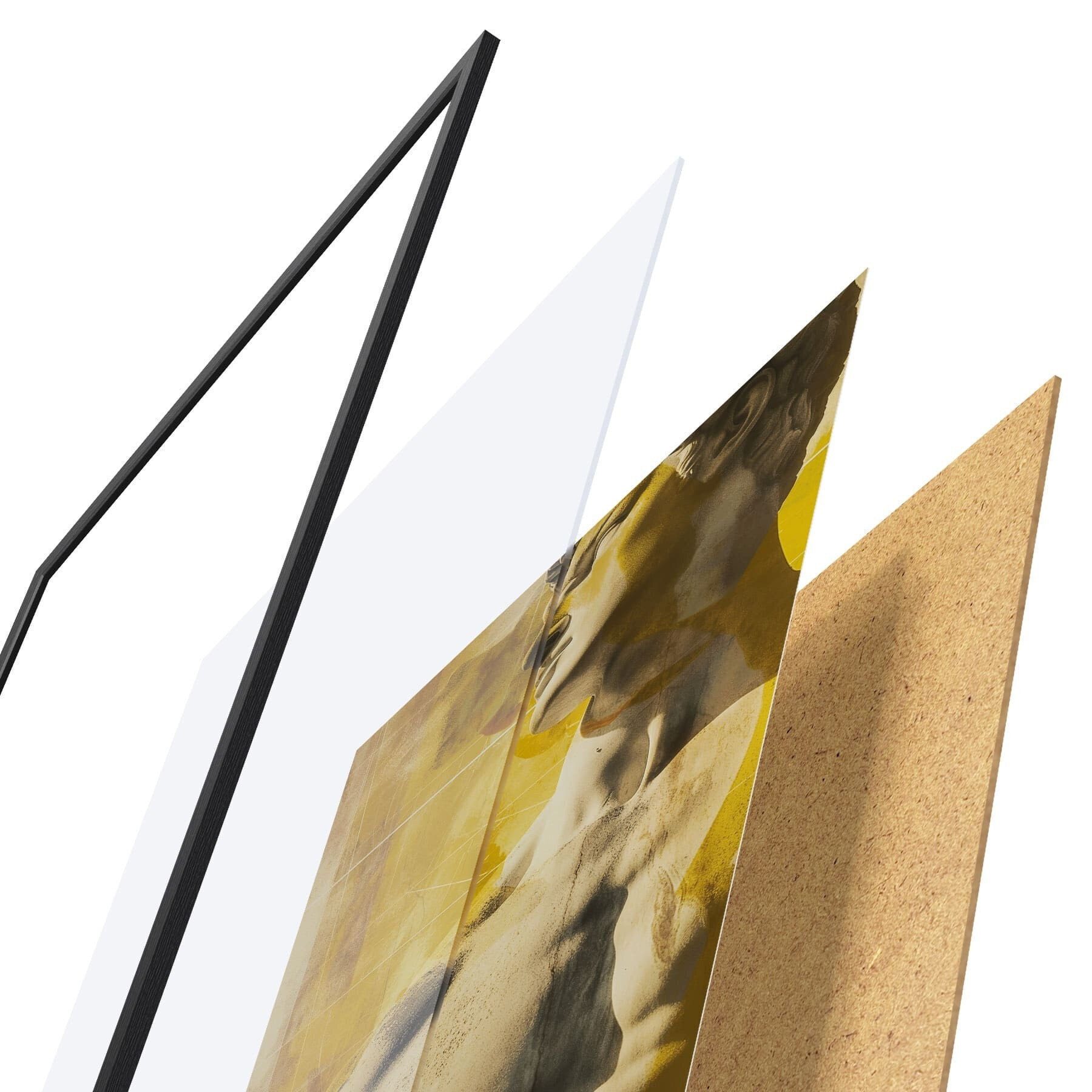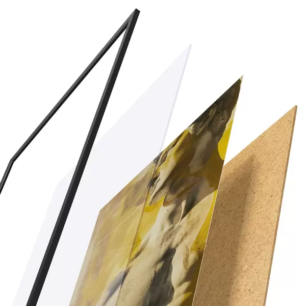 Das Poster besteht aus einem Rahmen, Plexiglas, einem gedruckten Bild und einer Rückwand aus Spanplatten. Dank der Halterungen auf der Rückseite kann das Poster sofort an die Wand gehängt werden.