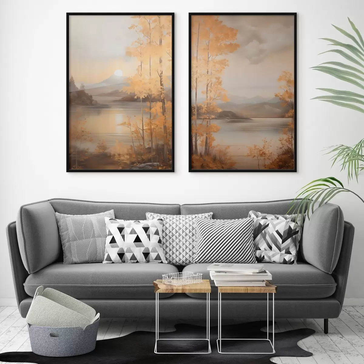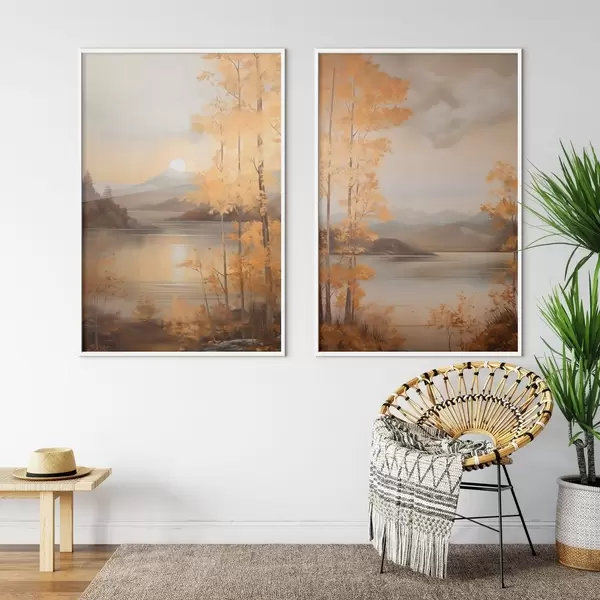 Poster Herbstliche Bäume mit orangefarbenen Blättern umrahmen einen ruhigen See mit fernen Bergen unter einem bewölkten Himmel. d01246