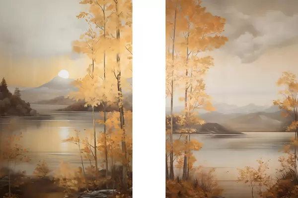 Poster Herbstliche Bäume mit orangefarbenen Blättern umrahmen einen ruhigen See mit fernen Bergen unter einem bewölkten Himmel. d01246