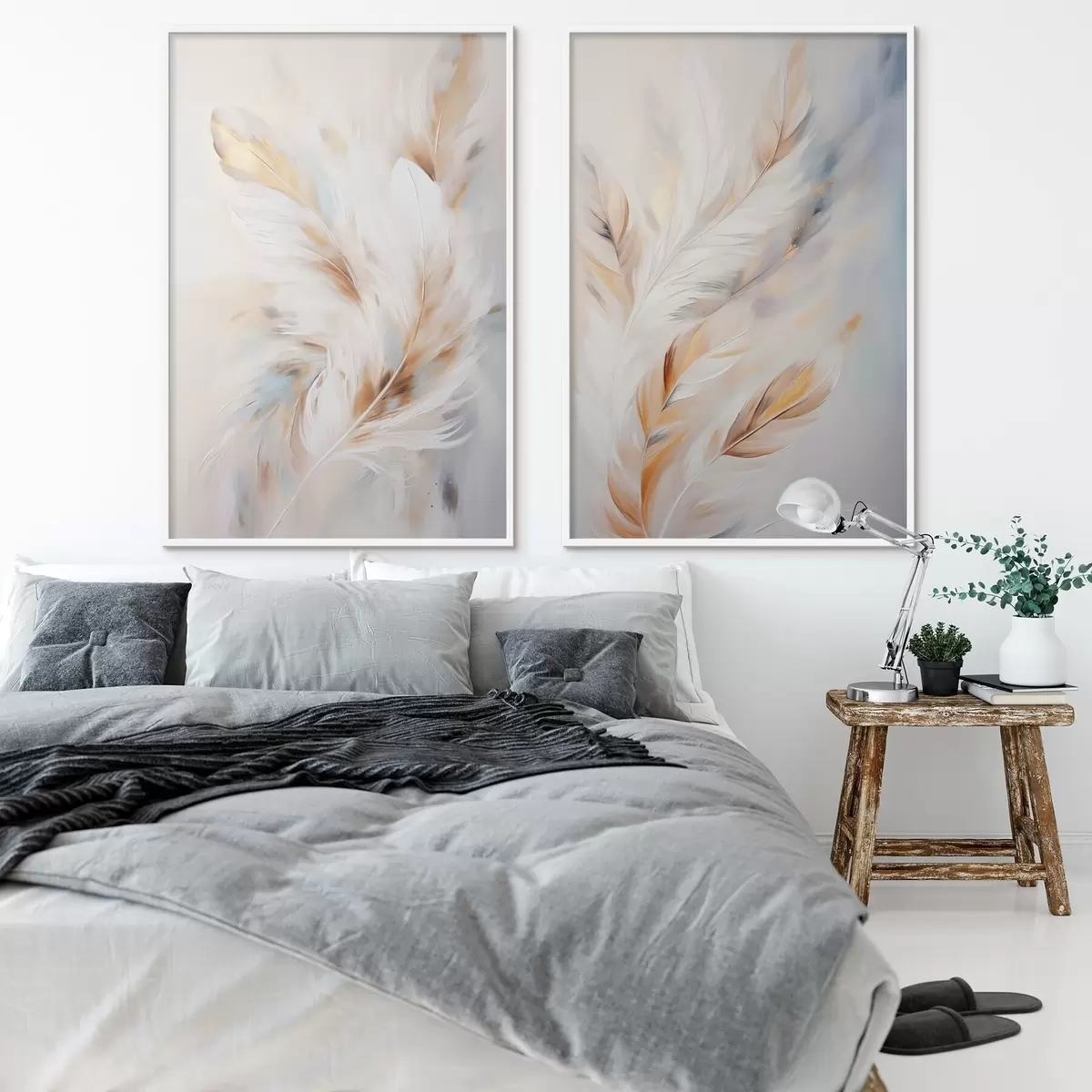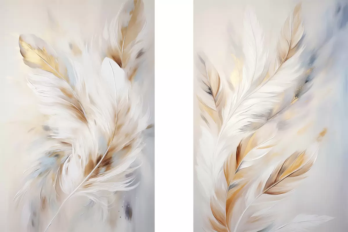 Poster Große, weiche Federn in einer Mischung aus Weiß-, Gelb- und Brauntönen vor einem hellen, abstrakten Hintergrund Nr d01247