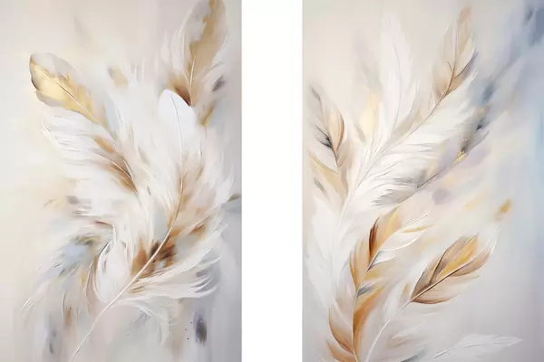Poster Große, weiche Federn in einer Mischung aus Weiß-, Gelb- und Brauntönen vor einem hellen, abstrakten Hintergrund Nr d01247