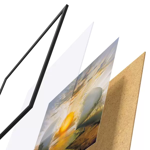 Das Poster besteht aus einem Rahmen, Plexiglas, einem gedruckten Bild und einer Rückwand aus Spanplatten. Dank der Halterungen auf der Rückseite kann das Poster sofort an die Wand gehängt werden.