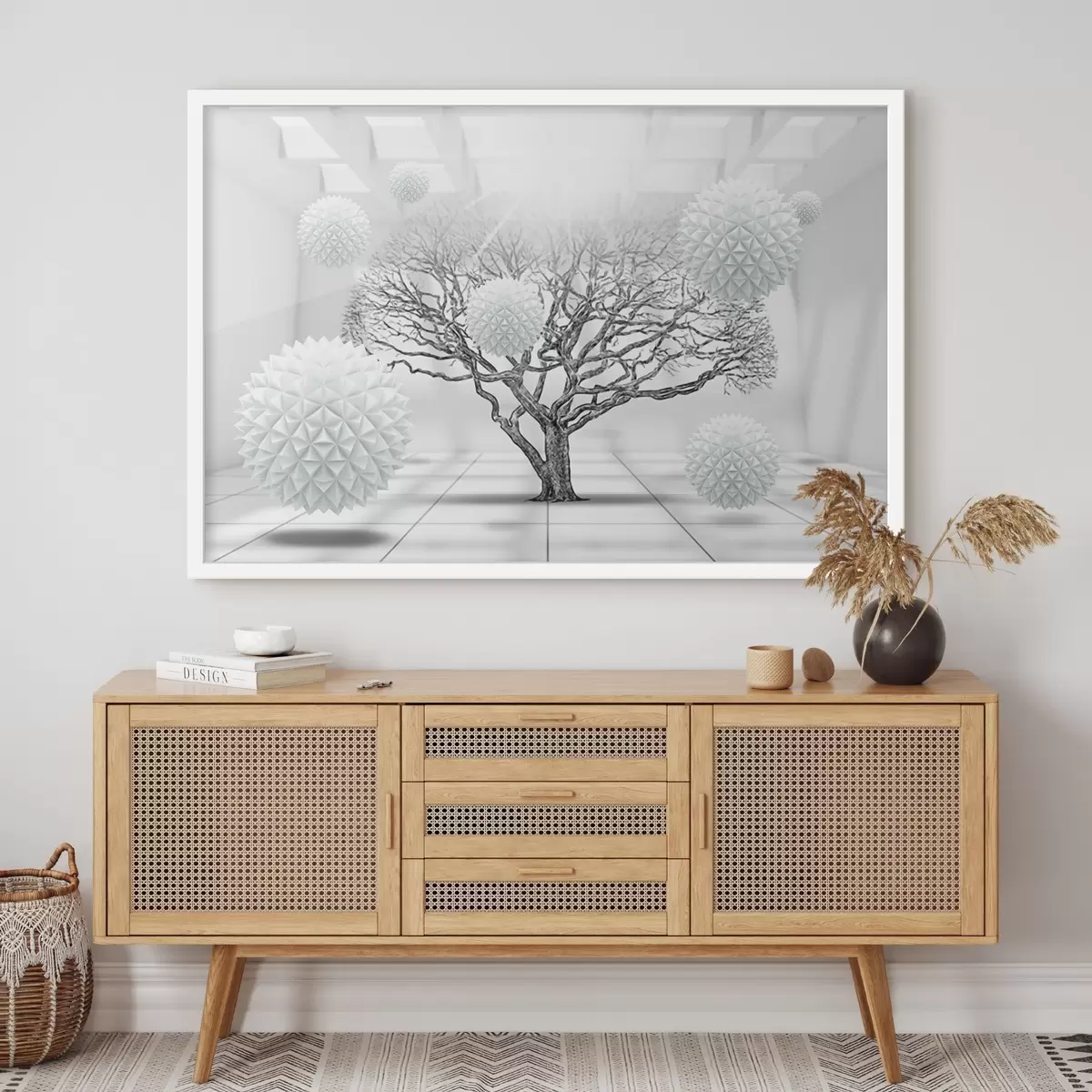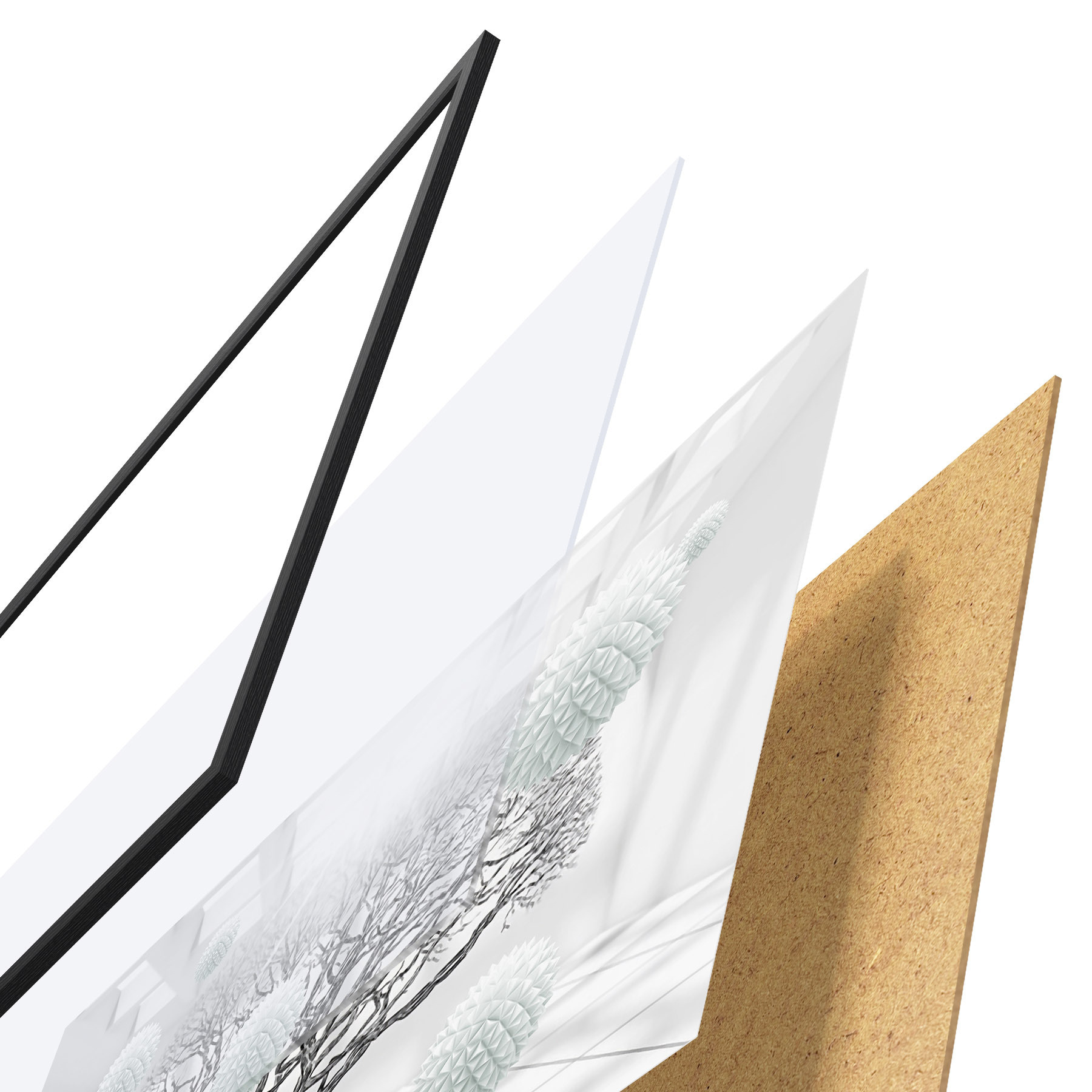 Das Poster besteht aus einem Rahmen, Plexiglas, einem gedruckten Bild und einer Rückwand aus Spanplatten. Dank der Halterungen auf der Rückseite kann das Poster sofort an die Wand gehängt werden.