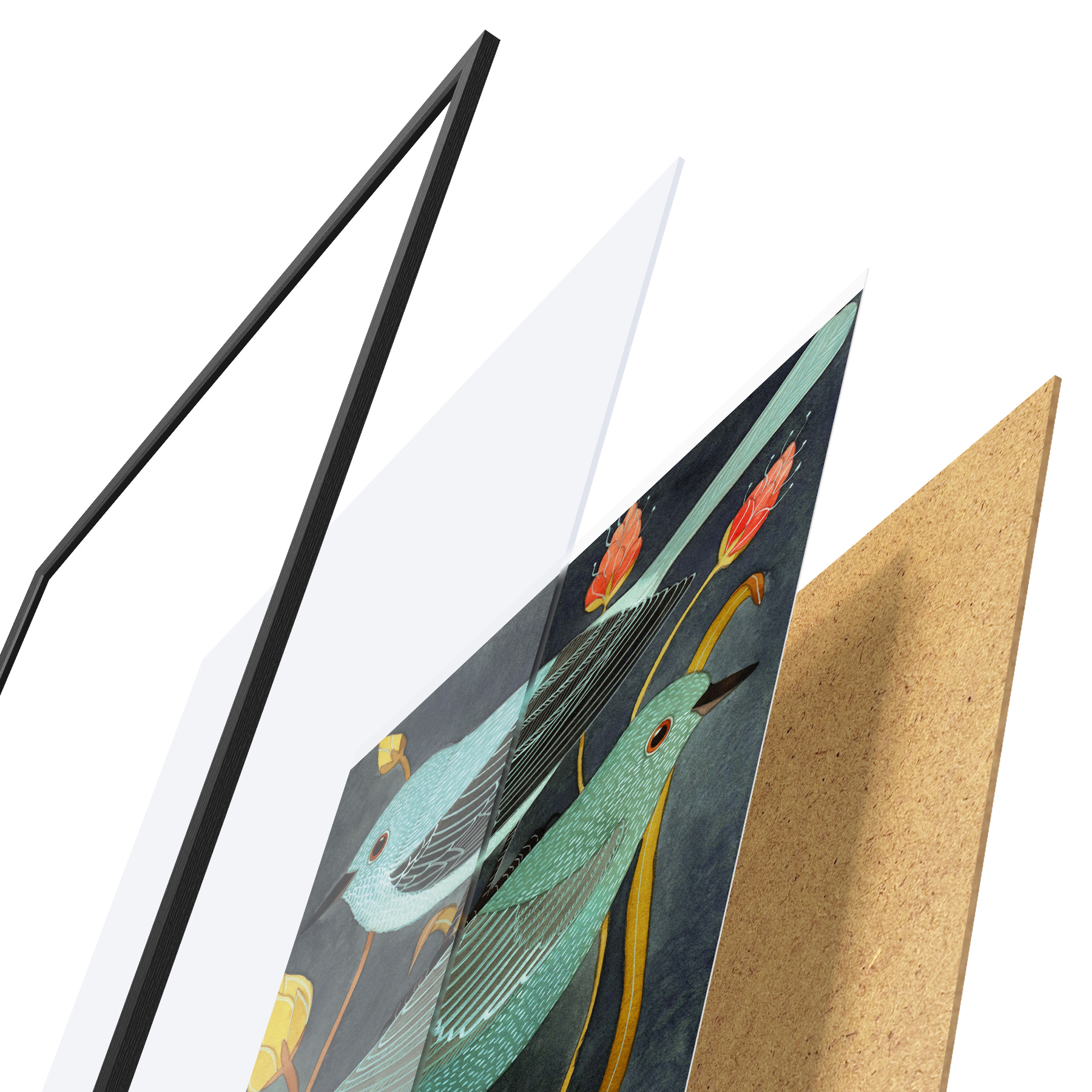 Das Poster besteht aus einem Rahmen, Plexiglas, einem gedruckten Bild und einer Rückwand aus Spanplatten. Dank der Halterungen auf der Rückseite kann das Poster sofort an die Wand gehängt werden.
