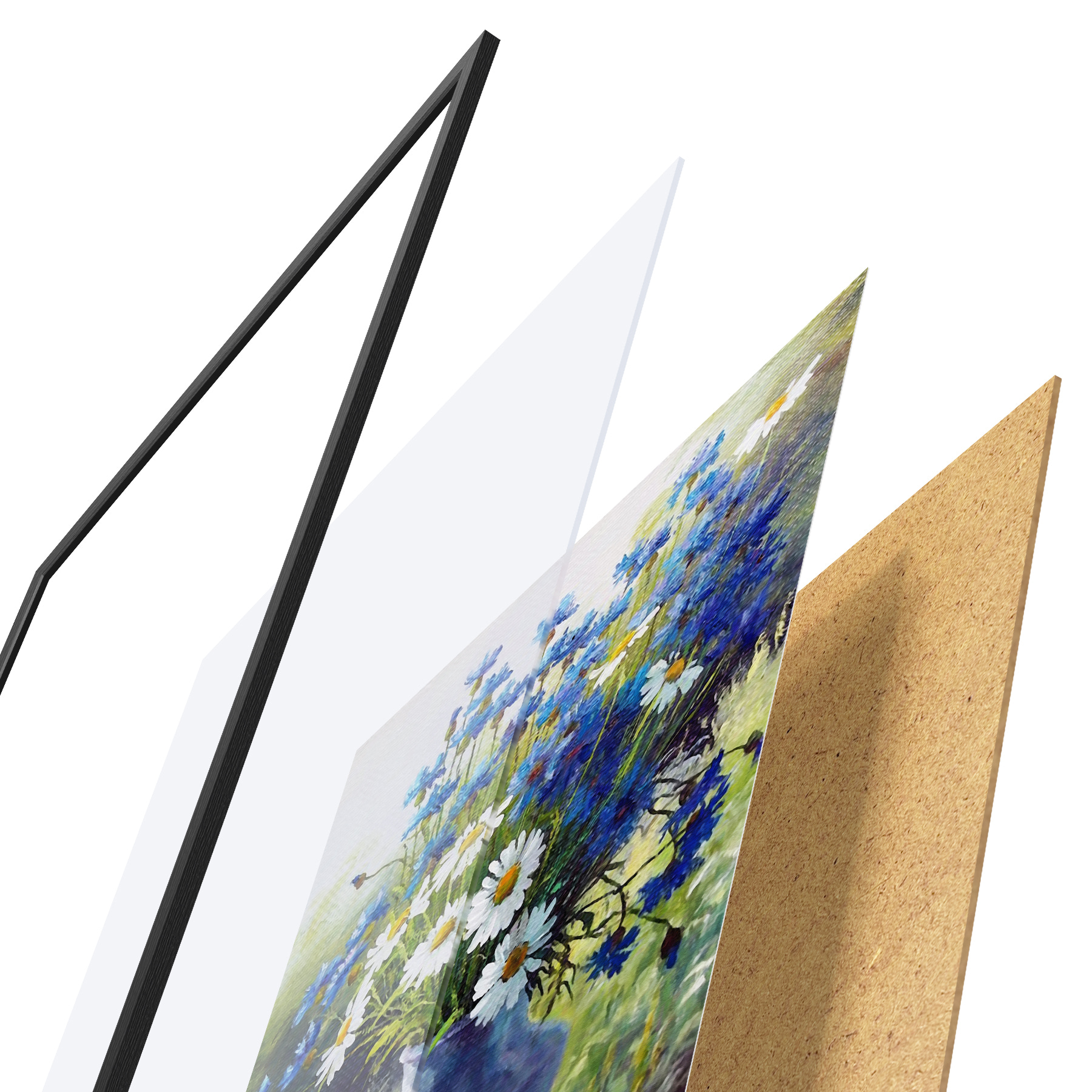 Das Poster besteht aus einem Rahmen, Plexiglas, einem gedruckten Bild und einer Rückwand aus Spanplatten. Dank der Halterungen auf der Rückseite kann das Poster sofort an die Wand gehängt werden.