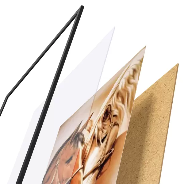 Das Poster besteht aus einem Rahmen, Plexiglas, einem gedruckten Bild und einer Rückwand aus Spanplatten. Dank der Halterungen auf der Rückseite kann das Poster sofort an die Wand gehängt werden.