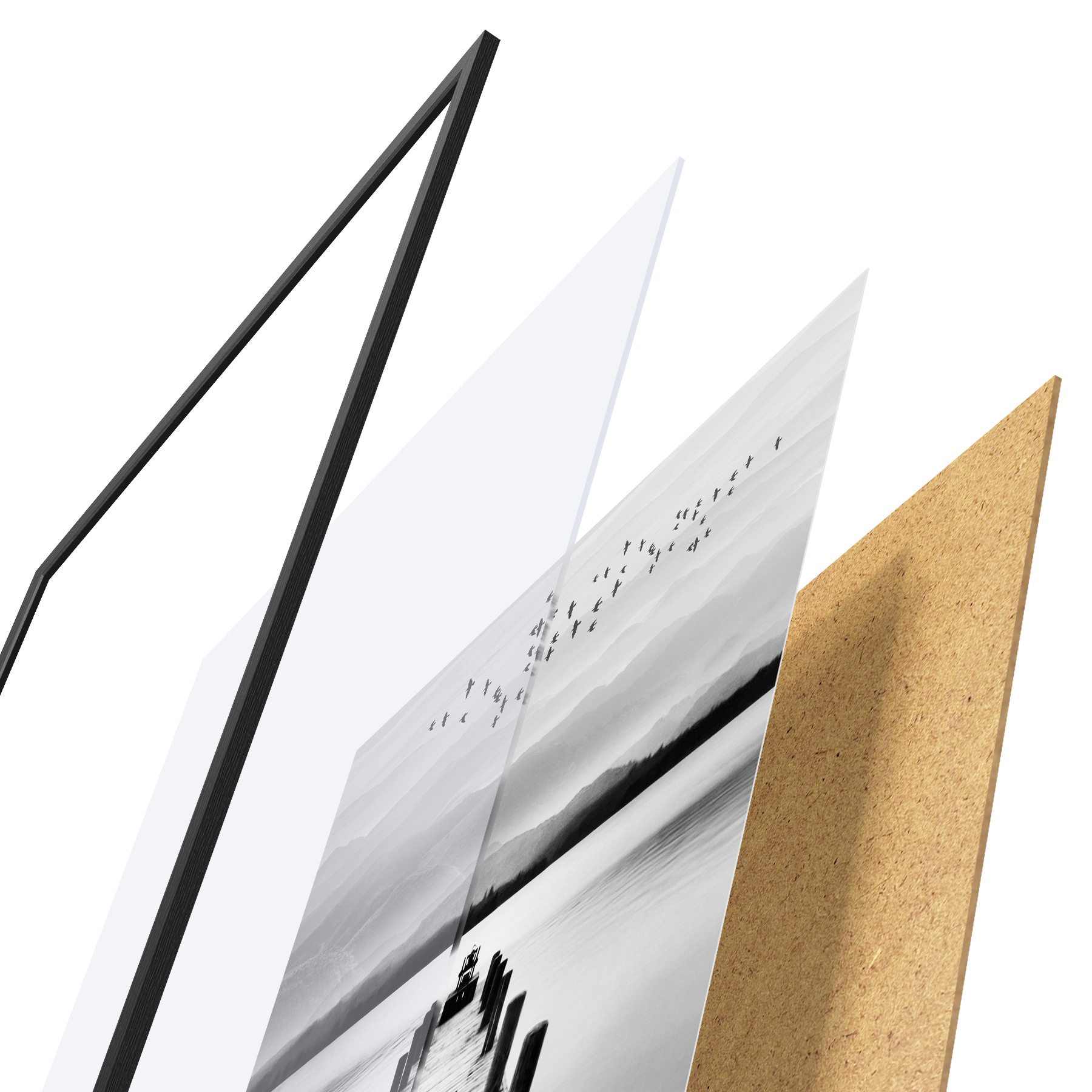 Das Poster besteht aus einem Rahmen, Plexiglas, einem gedruckten Bild und einer Rückwand aus Spanplatten. Dank der Halterungen auf der Rückseite kann das Poster sofort an die Wand gehängt werden.