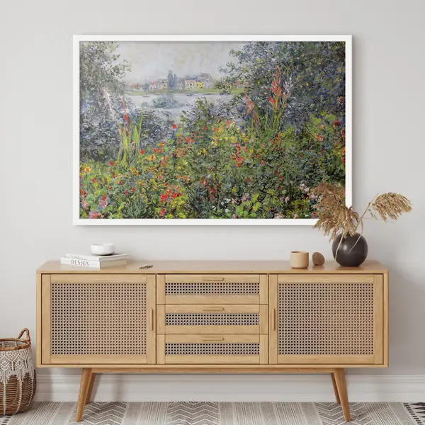 Poster Üppiger Garten am ruhigen Fluss f04136