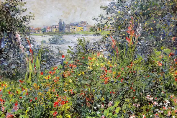 Poster Üppiger Garten am ruhigen Fluss Nr f04136