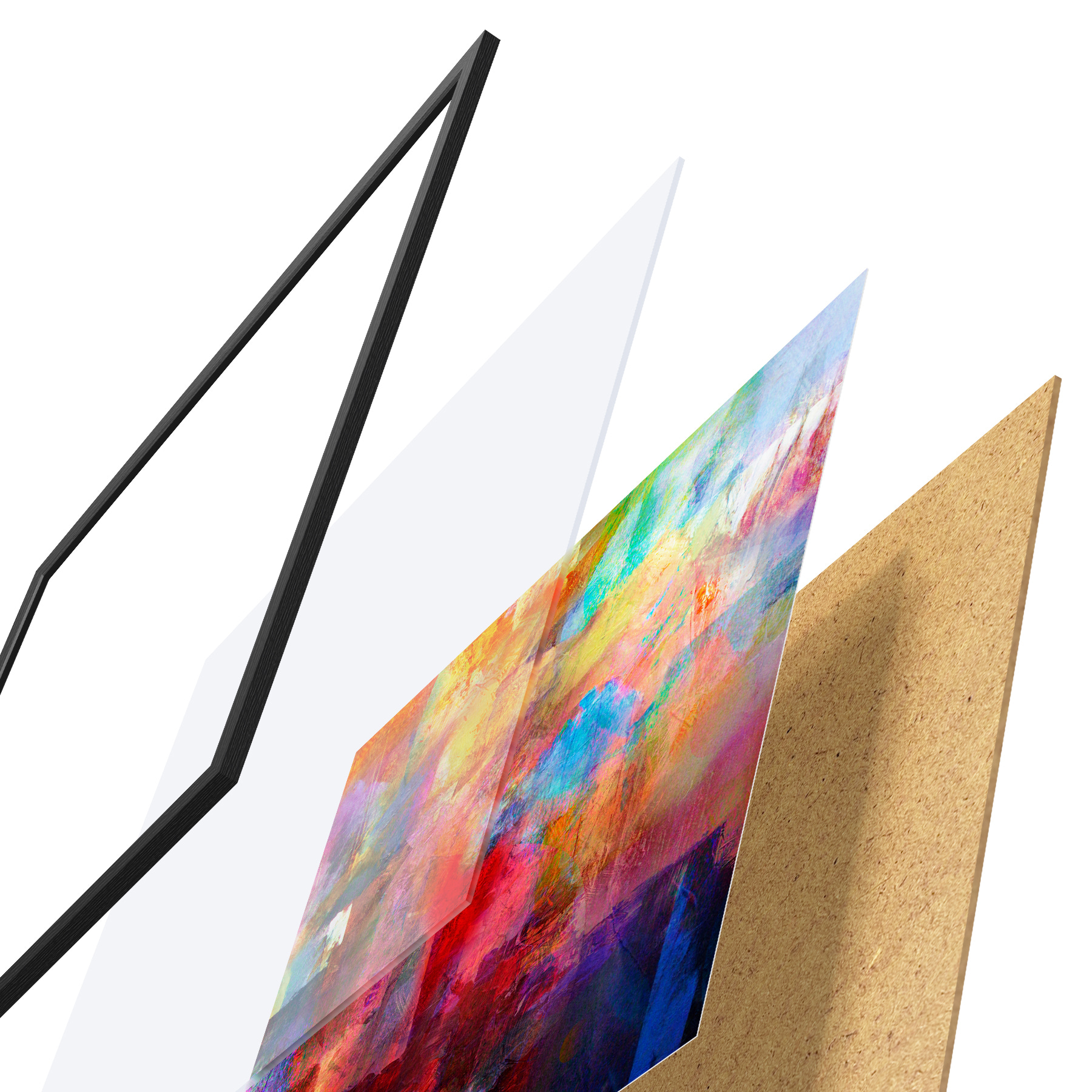 Das Poster besteht aus einem Rahmen, Plexiglas, einem gedruckten Bild und einer Rückwand aus Spanplatten. Dank der Halterungen auf der Rückseite kann das Poster sofort an die Wand gehängt werden.