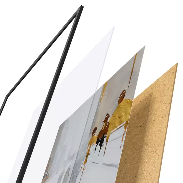 Das Poster besteht aus einem Rahmen, Plexiglas, einem gedruckten Bild und einer Rückwand aus Spanplatten. Dank der Halterungen auf der Rückseite kann das Poster sofort an die Wand gehängt werden.