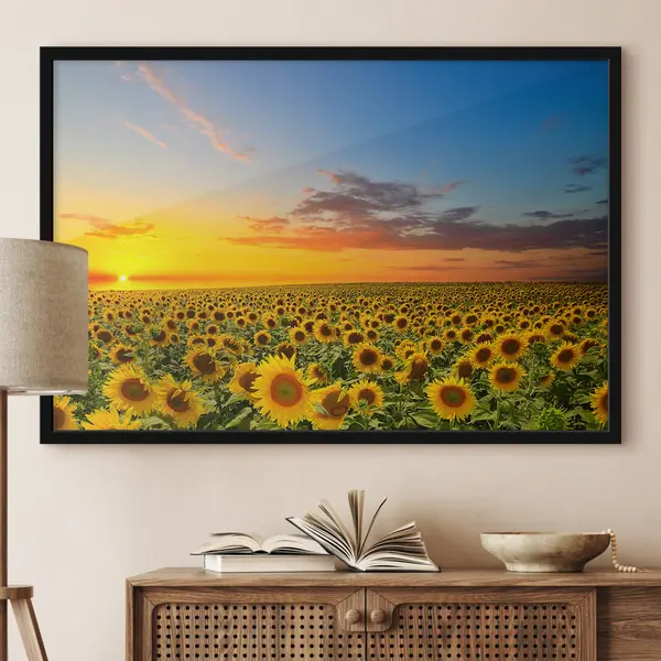 Poster Sonnenblumenfeld bei Sonnenuntergang. Eine wunderschöne Aussicht f05429
