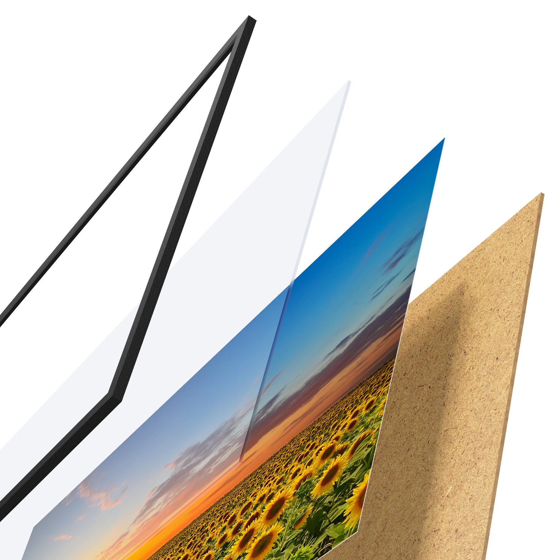 Das Poster besteht aus einem Rahmen, Plexiglas, einem gedruckten Bild und einer Rückwand aus Spanplatten. Dank der Halterungen auf der Rückseite kann das Poster sofort an die Wand gehängt werden.