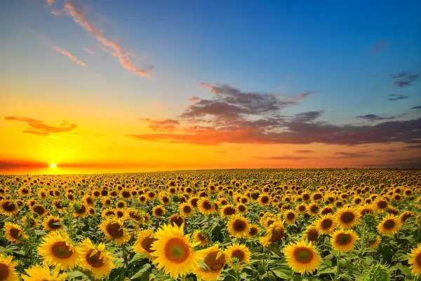 Poster Sonnenblumenfeld bei Sonnenuntergang. Eine wunderschöne Aussicht f05429