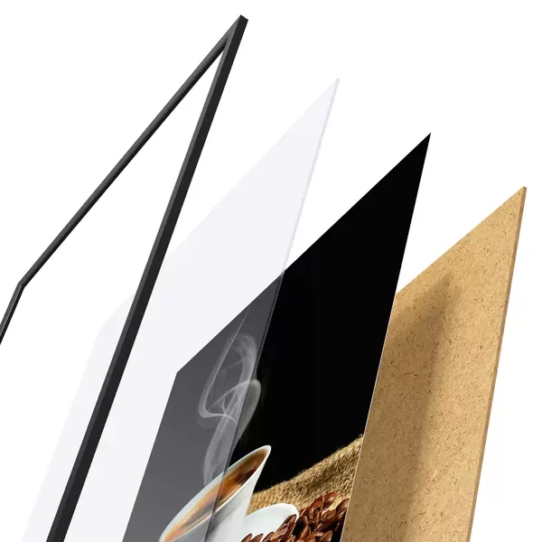 Das Poster besteht aus einem Rahmen, Plexiglas, einem gedruckten Bild und einer Rückwand aus Spanplatten. Dank der Halterungen auf der Rückseite kann das Poster sofort an die Wand gehängt werden.