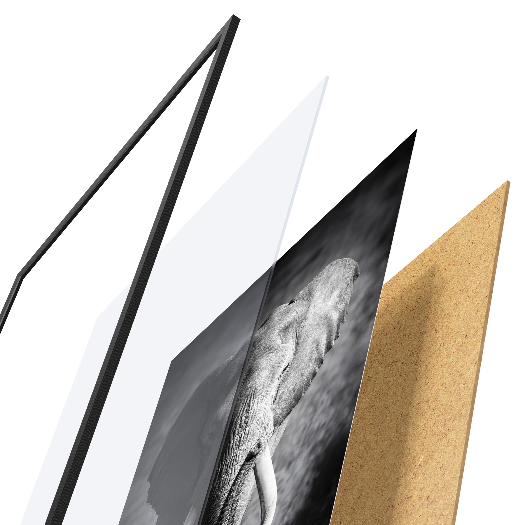Das Poster besteht aus einem Rahmen, Plexiglas, einem gedruckten Bild und einer Rückwand aus Spanplatten. Dank der Halterungen auf der Rückseite kann das Poster sofort an die Wand gehängt werden.