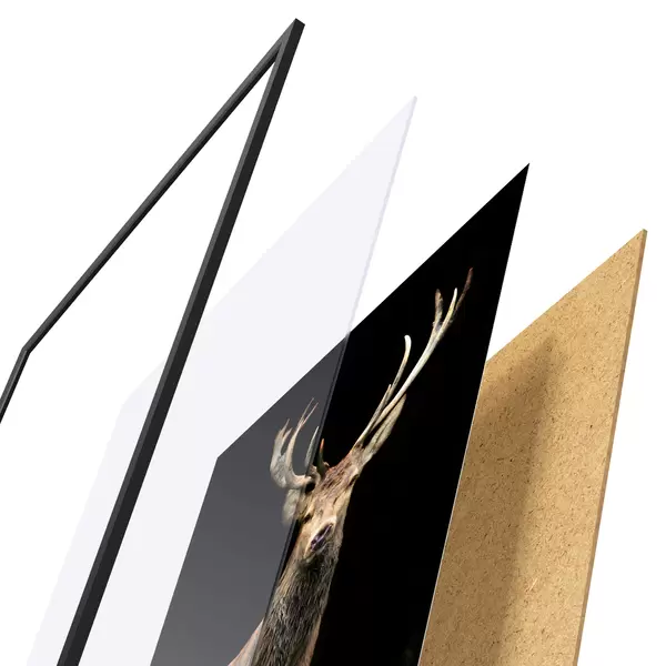 Das Poster besteht aus einem Rahmen, Plexiglas, einem gedruckten Bild und einer Rückwand aus Spanplatten. Dank der Halterungen auf der Rückseite kann das Poster sofort an die Wand gehängt werden.