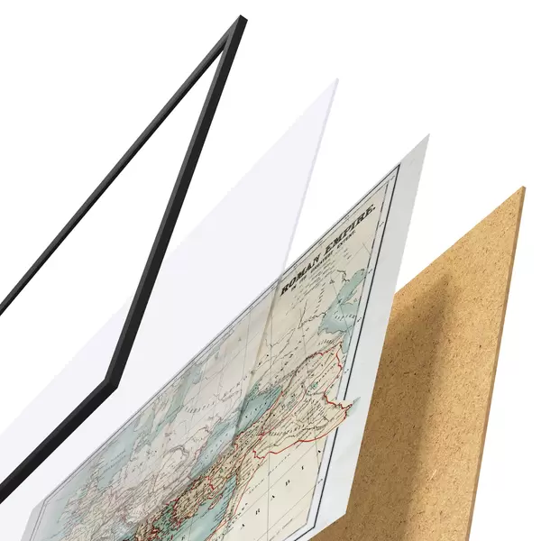 Das Poster besteht aus einem Rahmen, Plexiglas, einem gedruckten Bild und einer Rückwand aus Spanplatten. Dank der Halterungen auf der Rückseite kann das Poster sofort an die Wand gehängt werden.