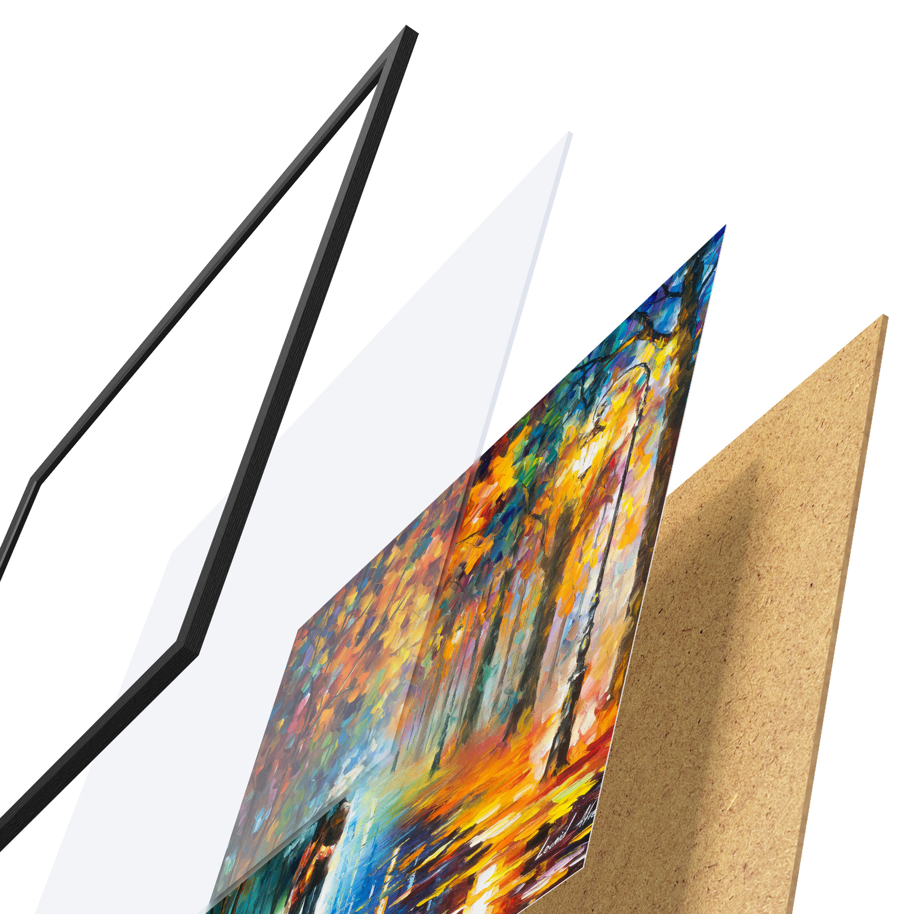 Das Poster besteht aus einem Rahmen, Plexiglas, einem gedruckten Bild und einer Rückwand aus Spanplatten. Dank der Halterungen auf der Rückseite kann das Poster sofort an die Wand gehängt werden.
