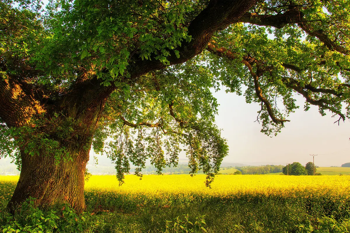 Poster Majestätischer Baum neben goldenem Feld f15283