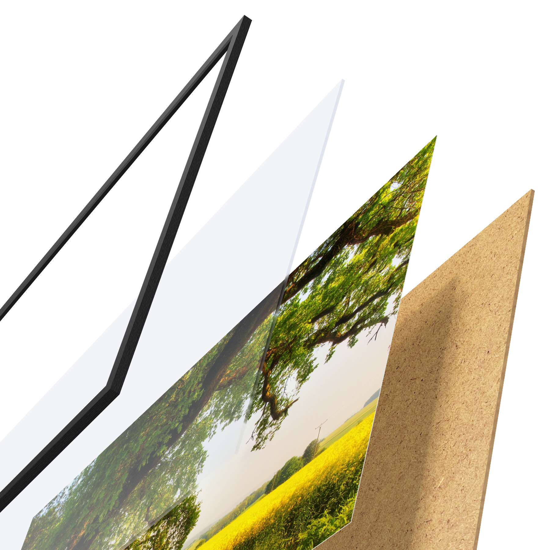 Das Poster besteht aus einem Rahmen, Plexiglas, einem gedruckten Bild und einer Rückwand aus Spanplatten. Dank der Halterungen auf der Rückseite kann das Poster sofort an die Wand gehängt werden.