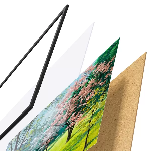 Das Poster besteht aus einem Rahmen, Plexiglas, einem gedruckten Bild und einer Rückwand aus Spanplatten. Dank der Halterungen auf der Rückseite kann das Poster sofort an die Wand gehängt werden.