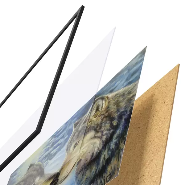 Das Poster besteht aus einem Rahmen, Plexiglas, einem gedruckten Bild und einer Rückwand aus Spanplatten. Dank der Halterungen auf der Rückseite kann das Poster sofort an die Wand gehängt werden.