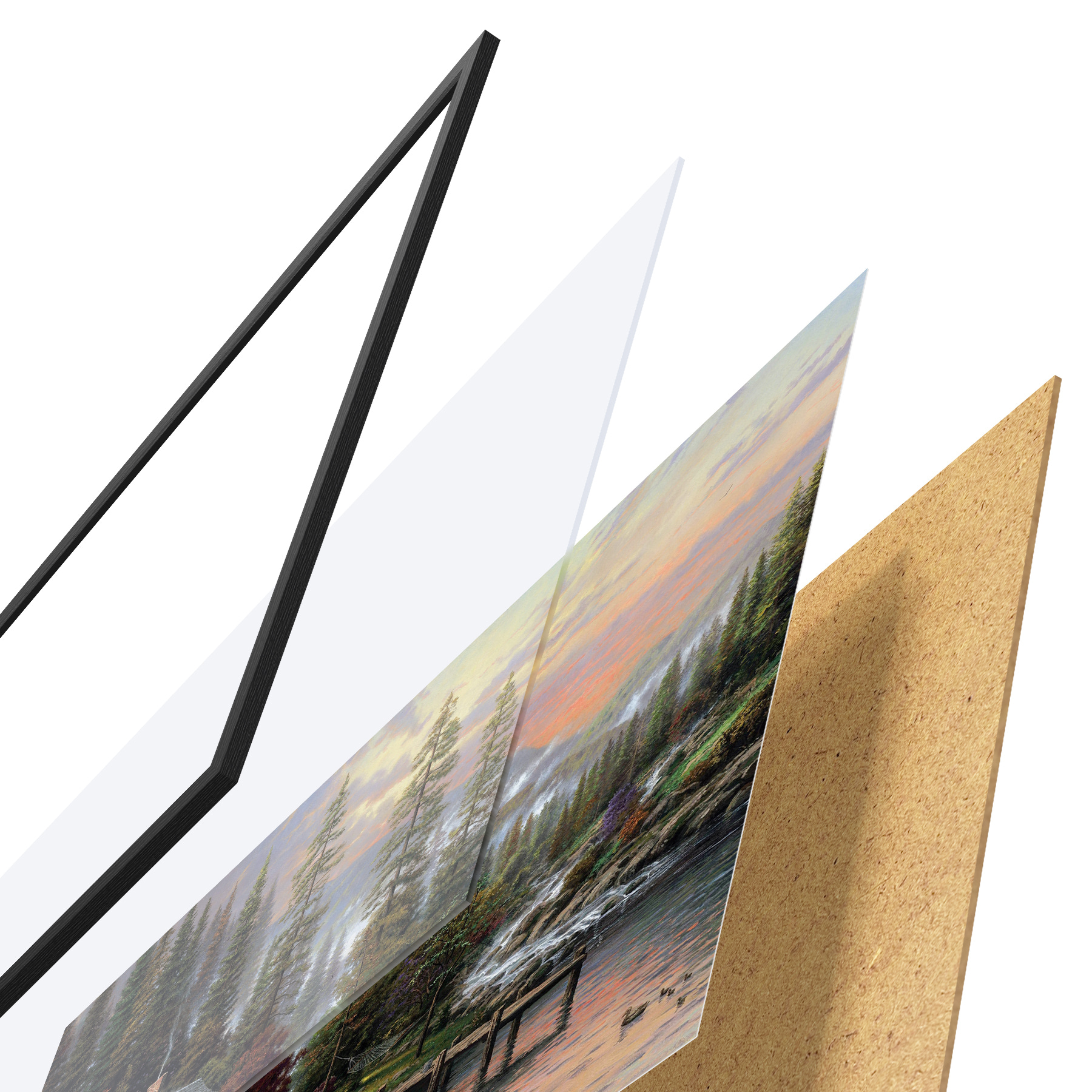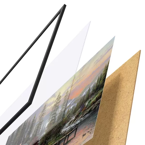 Das Poster besteht aus einem Rahmen, Plexiglas, einem gedruckten Bild und einer Rückwand aus Spanplatten. Dank der Halterungen auf der Rückseite kann das Poster sofort an die Wand gehängt werden.