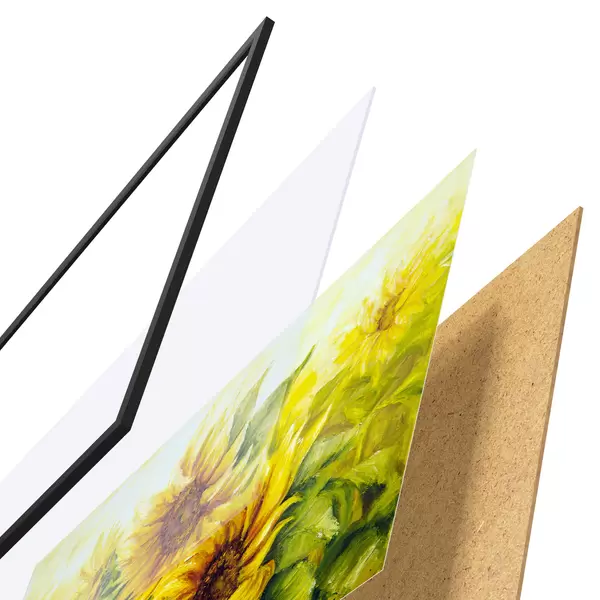 Das Poster besteht aus einem Rahmen, Plexiglas, einem gedruckten Bild und einer Rückwand aus Spanplatten. Dank der Halterungen auf der Rückseite kann das Poster sofort an die Wand gehängt werden.