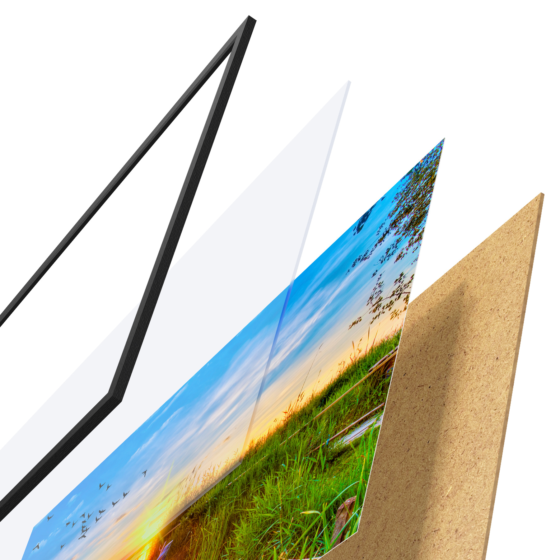 Das Poster besteht aus einem Rahmen, Plexiglas, einem gedruckten Bild und einer Rückwand aus Spanplatten. Dank der Halterungen auf der Rückseite kann das Poster sofort an die Wand gehängt werden.