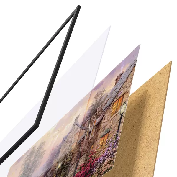 Das Poster besteht aus einem Rahmen, Plexiglas, einem gedruckten Bild und einer Rückwand aus Spanplatten. Dank der Halterungen auf der Rückseite kann das Poster sofort an die Wand gehängt werden.