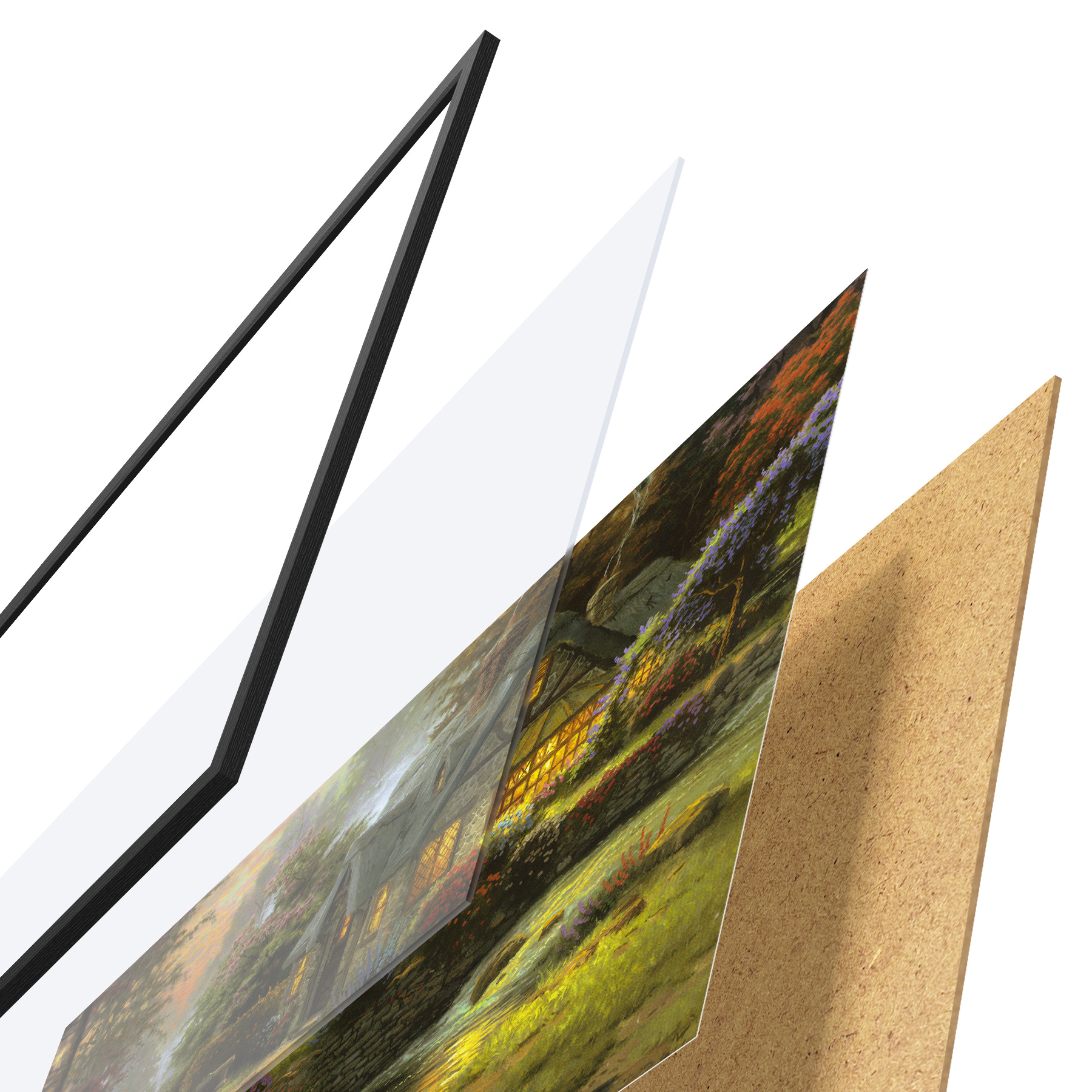 Das Poster besteht aus einem Rahmen, Plexiglas, einem gedruckten Bild und einer Rückwand aus Spanplatten. Dank der Halterungen auf der Rückseite kann das Poster sofort an die Wand gehängt werden.