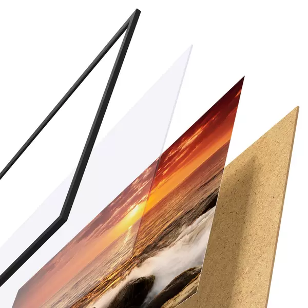 Das Poster besteht aus einem Rahmen, Plexiglas, einem gedruckten Bild und einer Rückwand aus Spanplatten. Dank der Halterungen auf der Rückseite kann das Poster sofort an die Wand gehängt werden.