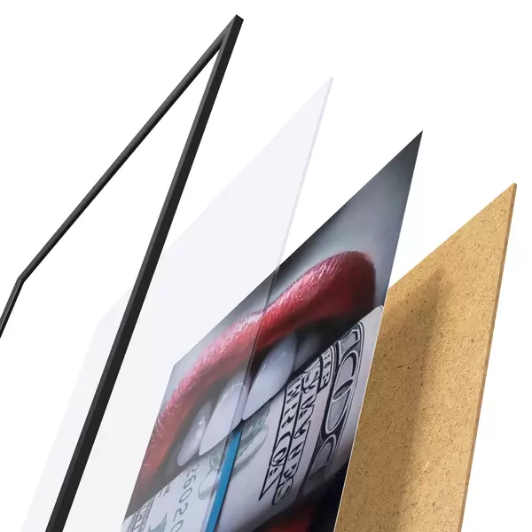 Das Poster besteht aus einem Rahmen, Plexiglas, einem gedruckten Bild und einer Rückwand aus Spanplatten. Dank der Halterungen auf der Rückseite kann das Poster sofort an die Wand gehängt werden.