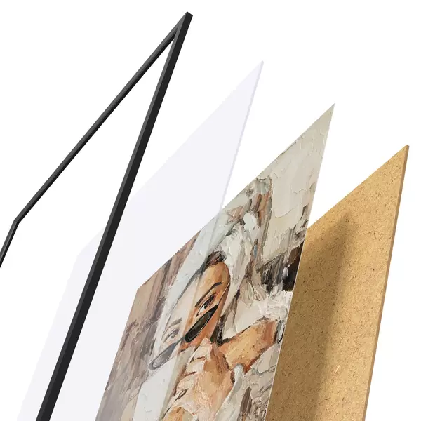 Das Poster besteht aus einem Rahmen, Plexiglas, einem gedruckten Bild und einer Rückwand aus Spanplatten. Dank der Halterungen auf der Rückseite kann das Poster sofort an die Wand gehängt werden.