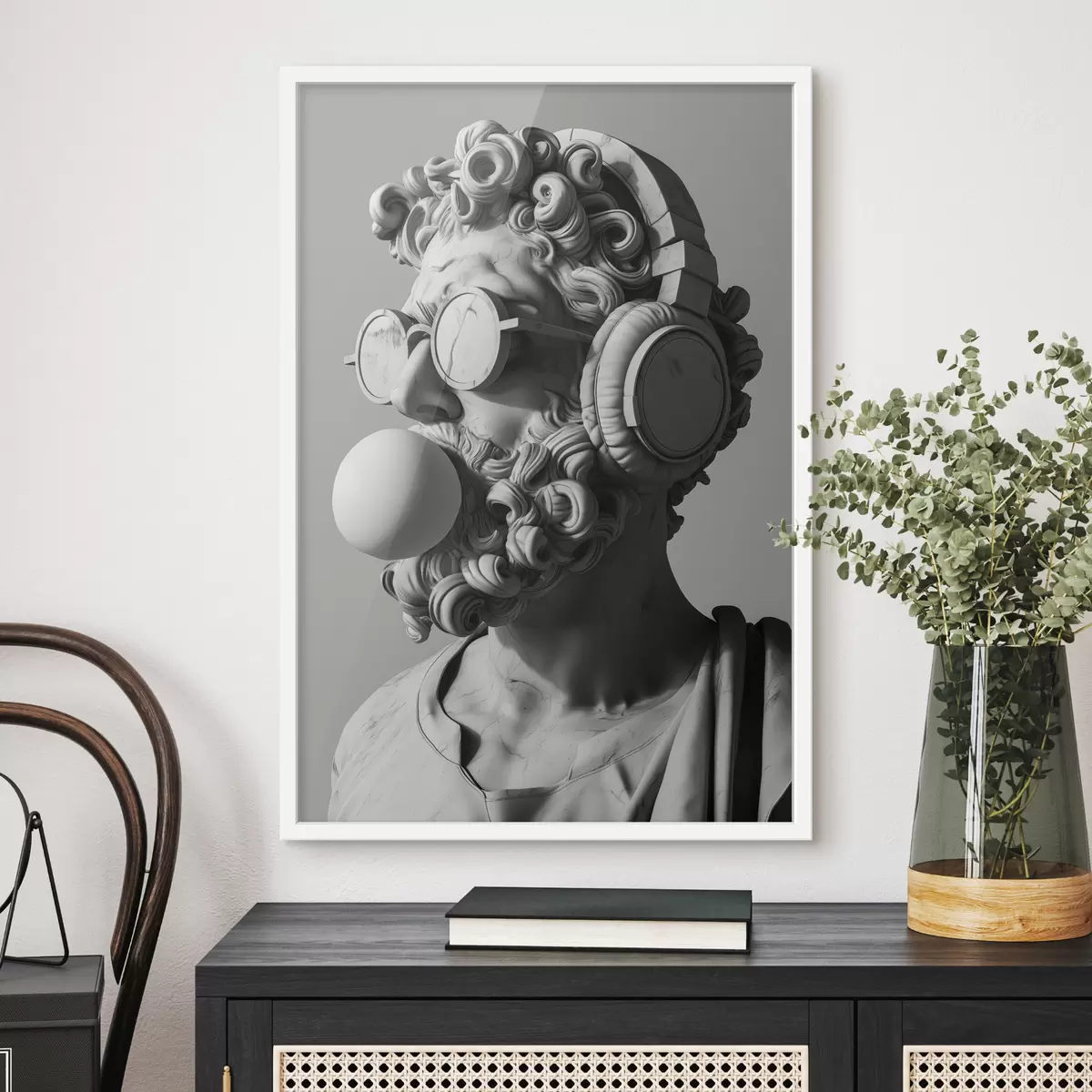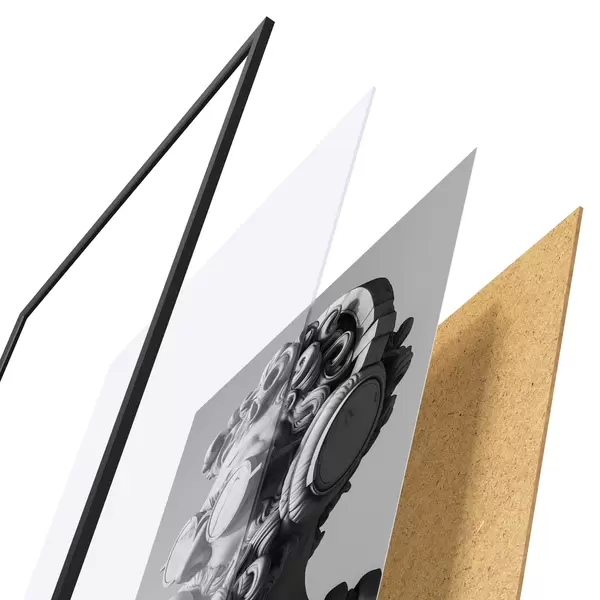 Das Poster besteht aus einem Rahmen, Plexiglas, einem gedruckten Bild und einer Rückwand aus Spanplatten. Dank der Halterungen auf der Rückseite kann das Poster sofort an die Wand gehängt werden.
