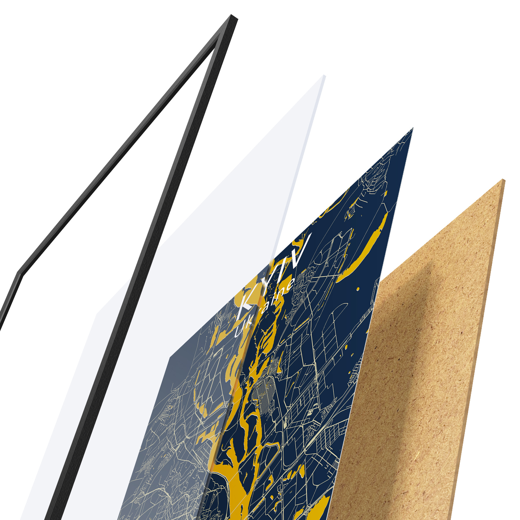 Das Poster besteht aus einem Rahmen, Plexiglas, einem gedruckten Bild und einer Rückwand aus Spanplatten. Dank der Halterungen auf der Rückseite kann das Poster sofort an die Wand gehängt werden.