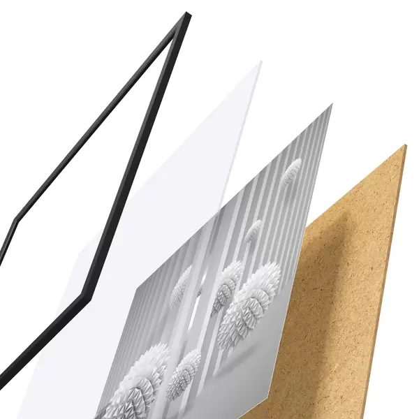 Das Poster besteht aus einem Rahmen, Plexiglas, einem gedruckten Bild und einer Rückwand aus Spanplatten. Dank der Halterungen auf der Rückseite kann das Poster sofort an die Wand gehängt werden.