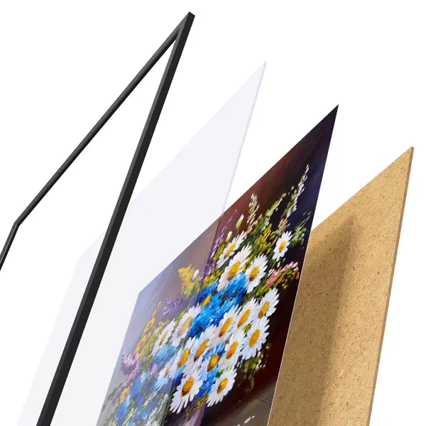 Das Poster besteht aus einem Rahmen, Plexiglas, einem gedruckten Bild und einer Rückwand aus Spanplatten. Dank der Halterungen auf der Rückseite kann das Poster sofort an die Wand gehängt werden.
