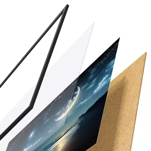 Das Poster besteht aus einem Rahmen, Plexiglas, einem gedruckten Bild und einer Rückwand aus Spanplatten. Dank der Halterungen auf der Rückseite kann das Poster sofort an die Wand gehängt werden.