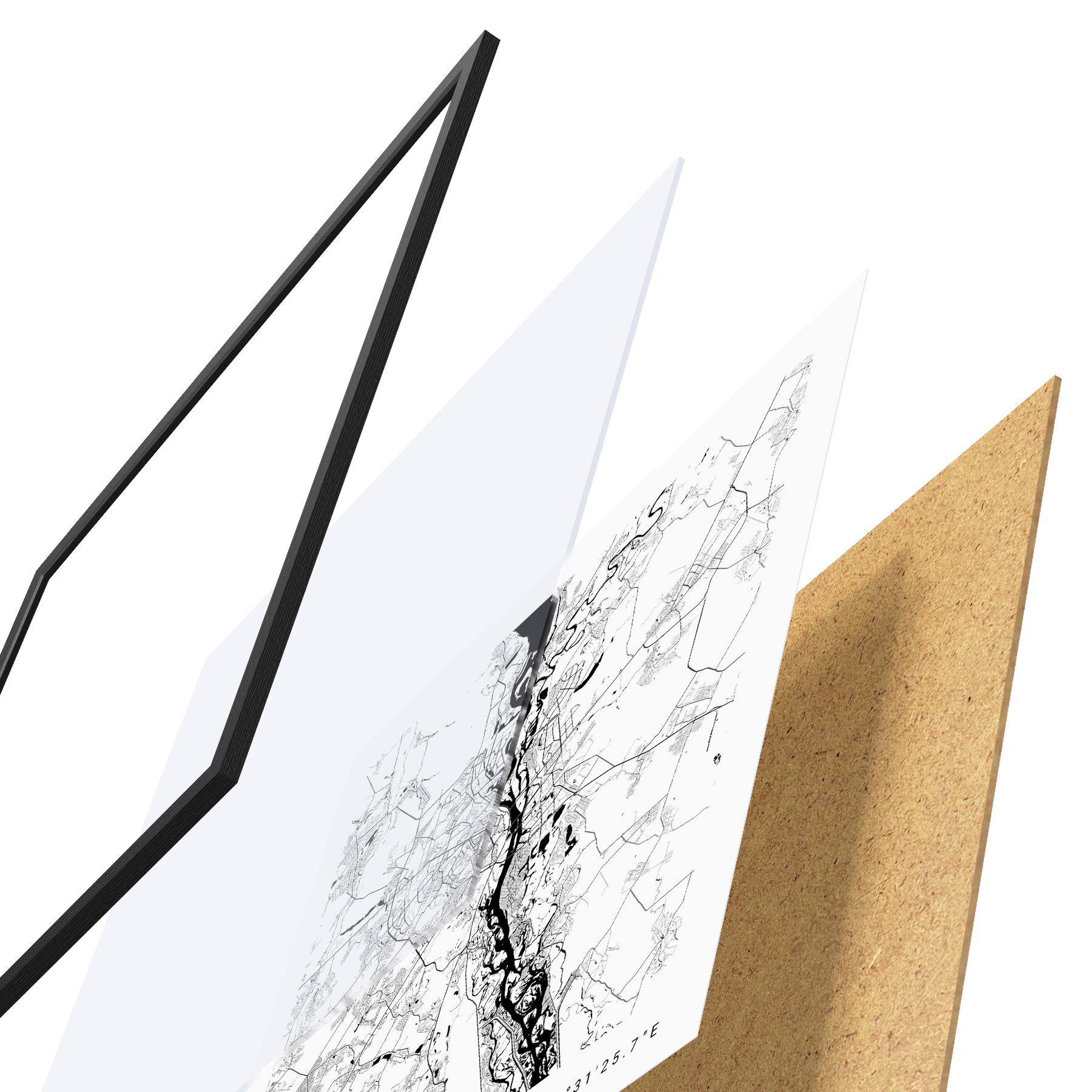 Das Poster besteht aus einem Rahmen, Plexiglas, einem gedruckten Bild und einer Rückwand aus Spanplatten. Dank der Halterungen auf der Rückseite kann das Poster sofort an die Wand gehängt werden.