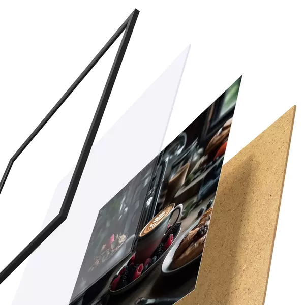 Das Poster besteht aus einem Rahmen, Plexiglas, einem gedruckten Bild und einer Rückwand aus Spanplatten. Dank der Halterungen auf der Rückseite kann das Poster sofort an die Wand gehängt werden.