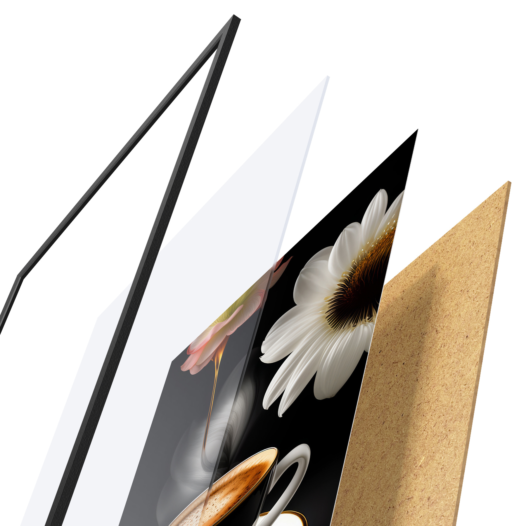 Das Poster besteht aus einem Rahmen, Plexiglas, einem gedruckten Bild und einer Rückwand aus Spanplatten. Dank der Halterungen auf der Rückseite kann das Poster sofort an die Wand gehängt werden.