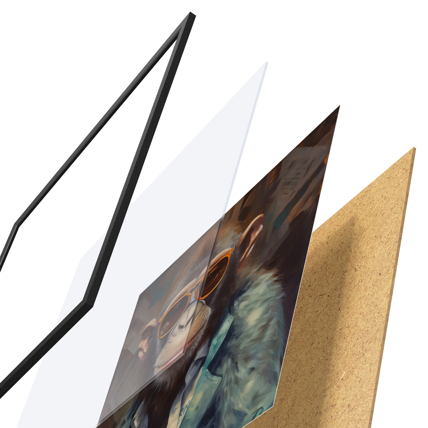 Das Poster besteht aus einem Rahmen, Plexiglas, einem gedruckten Bild und einer Rückwand aus Spanplatten. Dank der Halterungen auf der Rückseite kann das Poster sofort an die Wand gehängt werden.