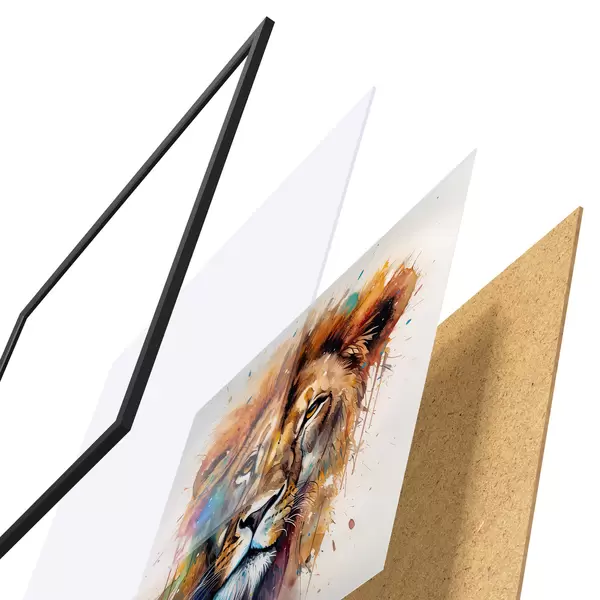 Das Poster besteht aus einem Rahmen, Plexiglas, einem gedruckten Bild und einer Rückwand aus Spanplatten. Dank der Halterungen auf der Rückseite kann das Poster sofort an die Wand gehängt werden.